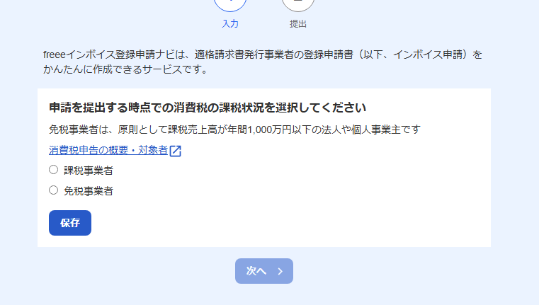 まず、申請を提出する時点での消費税の課税状況を選択します。