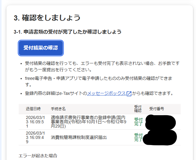 提出後、しばらくして「受付結果の確認」を行ってみると、ステータスが「受付完了」になっていました。
