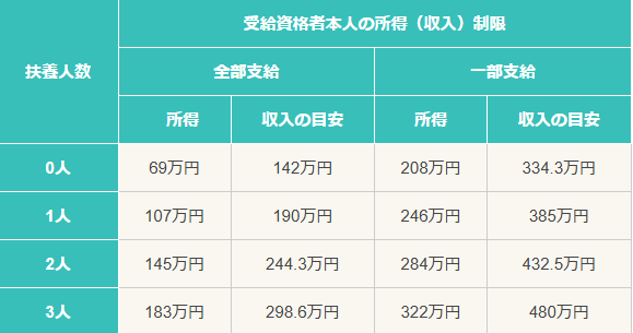 上記は満額支給の場合です。所得が多い場合はそれに応じて減額されていきます。
